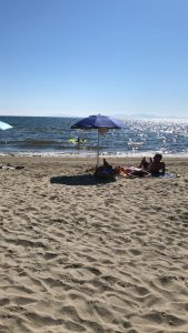 En strand, som vi oftast besöker, ligger på den norra delen av bukten. Den har toaletter och en liten bar. Här kan du hyra solstol och parasoll om du vill men det går också utmärkt att bara lägga ner sin egen filt.