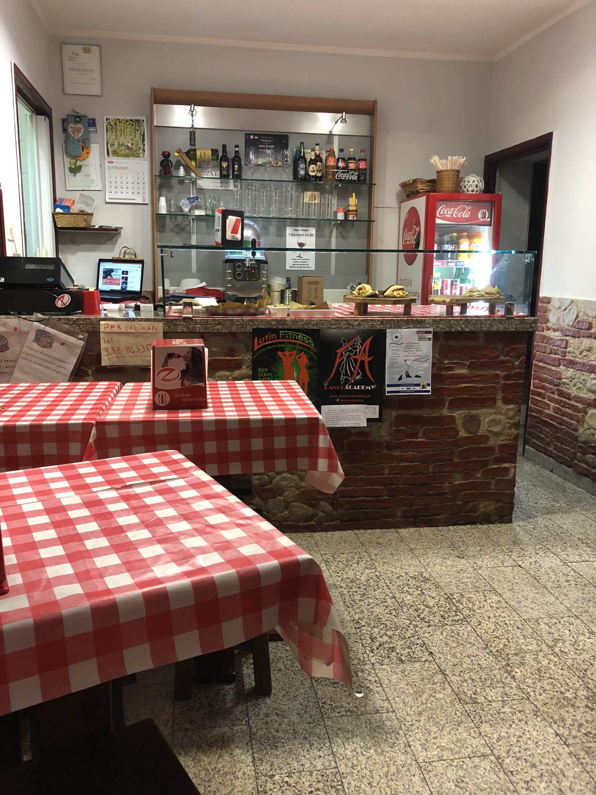 Mitt inne i byn finns en bra pizzeria. Du kan alltid köpa ”pizza al taglio” pizza i fyrkantiga bitar. Men det går också att beställa vanliga runda pizzor, dessa kan du ta hem eller äta på piazzan bredvid pizzerian. Riktig bra pizzor.